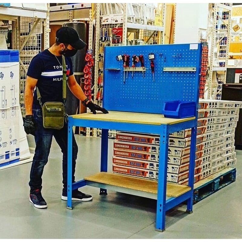 Banco de trabajo sin tornillos con bandejas de madera. Incluye panel perforado para guardar herramientas y cuyo montaje sí que lleva tornillos. Es de color AZUL/MADERA.Tiene 2 estantes. Las dimensiones de esta Estantería son: 1445x1510x610 mm. Y tiene una capacidad de carga de 600 kgs el estante principal y 250 kgs el estante inferior. Es fabricado en España y se monta rápido siguiendo las instrucciones.