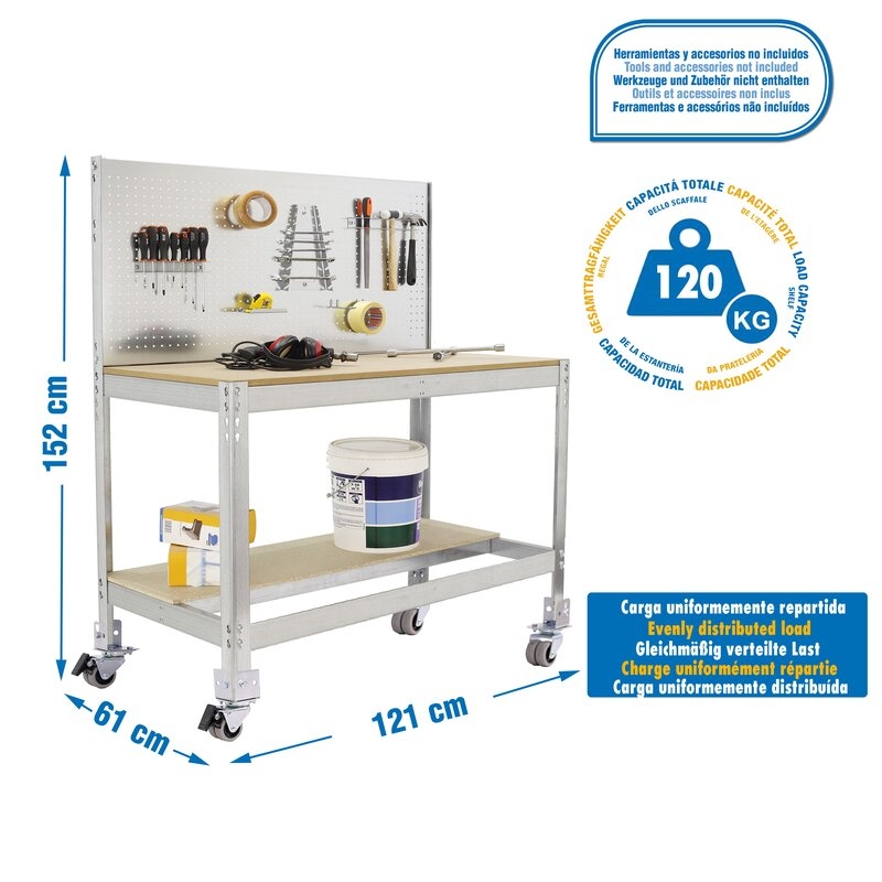 Banco de trabajo sin tornillos con bandejas de madera. Incluye ruedas. Incluye panel perforado para guardar herramientas y cuyo montaje sí que lleva tornillos. Es de color GALVA/MADERA.Tiene 2 estantes. Las dimensiones de esta Estantería son: 1560x1210x610 mm. Y tiene una capacidad de carga total de 120 kgs al llevar ruedas. Es fabricado en España y se monta rápido siguiendo las instrucciones.