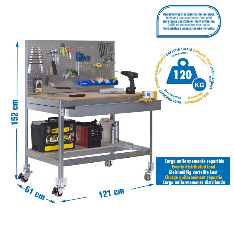 Banco de trabajo sin tornillos con bandejas de madera y cajón para almacenar herramientas. Incluye ruedas. Incluye panel perforado también para guardar herramientas y cuyo montaje sí que lleva tornillos. Es de color GALVA/MADERA.Tiene 2 estantes. Las dimensiones de esta Estantería son: 1560x1210x610 mm. Y tiene una capacidad de carga total de 120 kgs al llevar ruedas. Es fabricado en España y se monta rápido siguiendo las instrucciones.