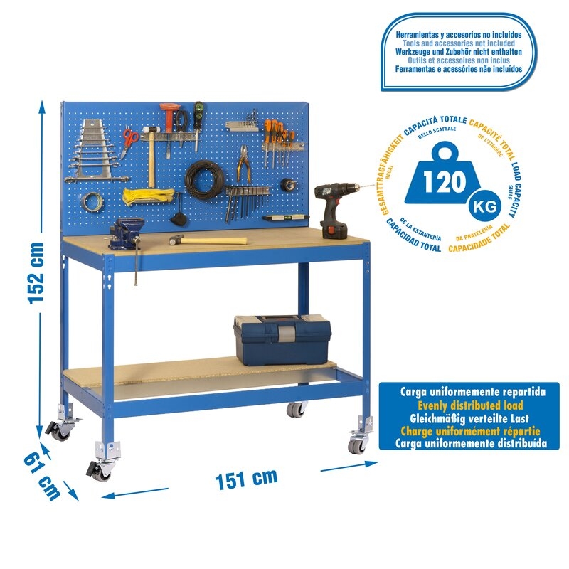 Banco de trabajo sin tornillos con bandejas de madera. Incluye ruedas. Incluye panel perforado para guardar herramientas y cuyo montaje sí que lleva tornillos. Es de color AZUL/MADERA.Tiene 2 estantes. Las dimensiones de esta Estantería son: 1560x1510x610 mm. Y tiene una capacidad de carga total de 120 kgs al llevar ruedas. Es fabricado en España y se monta rápido siguiendo las instrucciones.