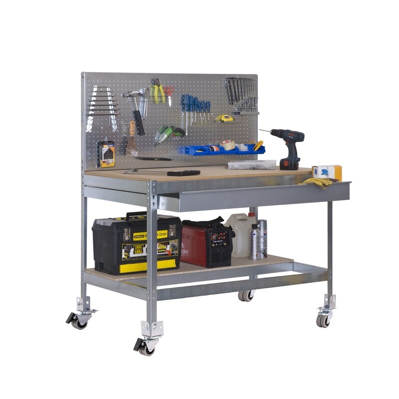 Banco de trabajo sin tornillos con bandejas de madera y cajón para almacenar herramientas. Incluye ruedas. Incluye panel perforado también para guardar herramientas y cuyo montaje sí que lleva tornillos. Es de color GALVA/MADERA.Tiene 2 estantes. Las dimensiones de esta Estantería son: 1560x1510x610 mm. Y tiene una capacidad de carga total de 120 kgs al llevar ruedas. Es fabricado en España y se monta rápido siguiendo las instrucciones.