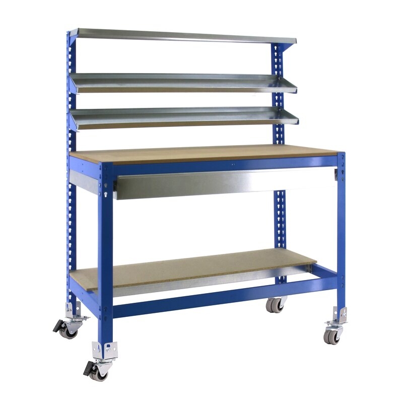 Banco de trabajo sin tornillos con bandejas de madera, 3 baldas reclinables y un cajón para guardar herramientas. Incluye ruedas. Es de color AZUL/MADERA.Tiene 5 estantes. Las dimensiones de esta Estantería son: 1560x910x610 mm. Y tiene una capacidad de carga total de 120 kgs al llevar ruedas. Es fabricado en España y se monta rápido siguiendo las instrucciones.