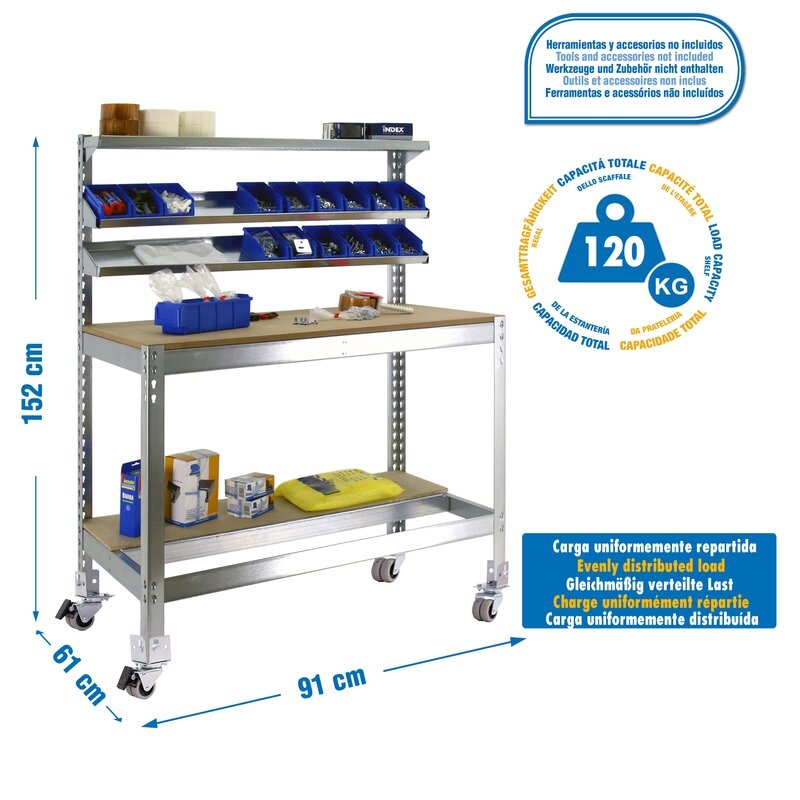 Banco de trabajo sin tornillos con bandejas de madera y 3 baldas reclinables. Incluye ruedas. Es de color GALVA/MADERA.Tiene 5 estantes. Las dimensiones de esta Estantería son: 1560x910x610 mm. Y tiene una capacidad de carga total de 120 kgs al llevar ruedas. Es fabricado en España y se monta rápido siguiendo las instrucciones.