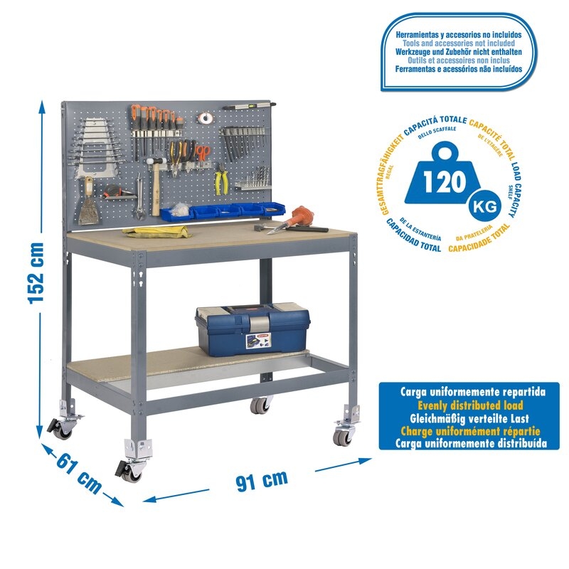 Banco de trabajo sin tornillos con bandejas de madera. Incluye ruedas. Incluye panel perforado para guardar herramientas y cuyo montaje sí que lleva tornillos. Es de color GRIS/MADERA.Tiene 2 estantes. Las dimensiones de esta Estantería son: 1560x910x610 mm. Y tiene una capacidad de carga total de 120 kgs al llevar ruedas. Es fabricado en España y se monta rápido siguiendo las instrucciones.