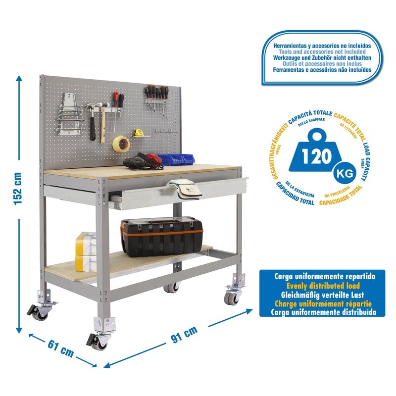 Banco de trabajo sin tornillos con bandejas de madera y cajón para almacenar herramientas. Incluye ruedas. Incluye panel perforado también para guardar herramientas y cuyo montaje sí que lleva tornillos. Es de color GRIS/MADERA.Tiene 2 estantes. Las dimensiones de esta Estantería son: 1560x910x610 mm. Y tiene una capacidad de carga total de 120 kgs al llevar ruedas. Es fabricado en España y se monta rápido siguiendo las instrucciones.