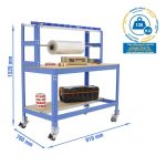 Banco de trabajo sin tornillos con bandejas de madera. Incluye ruedas. Incluye repisa superior (montaje con tornillos) y larguero cuelga rollos. Es de color AZUL/MADERA.Tiene 3 estantes. Las dimensiones de esta Estantería son: 1560x910x760 mm. Y tiene una capacidad de carga total de 120 kgs al llevar ruedas. Es fabricado en España y se monta rápido siguiendo las instrucciones.