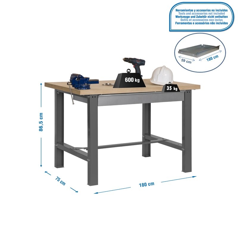 Banco de trabajo con tornillos y bandeja de madera. Incluye cajón. Es de color GRIS/MADERA.Tiene 1 estantes. Las dimensiones de esta Estantería son: 865x1800x750 mm. Y tiene una capacidad de carga de 600 kgs el estante. El cajón aguanta hasta 35 kgs. Es fabricado en España y se monta rápido siguiendo las instrucciones.