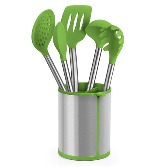 La caja para utensilios Prior es una opción perfecta para mantener tus herramientas de cocina ordenadas y a mano. Fabricada en acero inoxidable 18/10 y con nylon y silicona de color verde típico de la colección Prior, esta caja es muy útil para tener siempre al alcance espátulas, espumaderas, cucharones y otros elementos esenciales para cocinar.