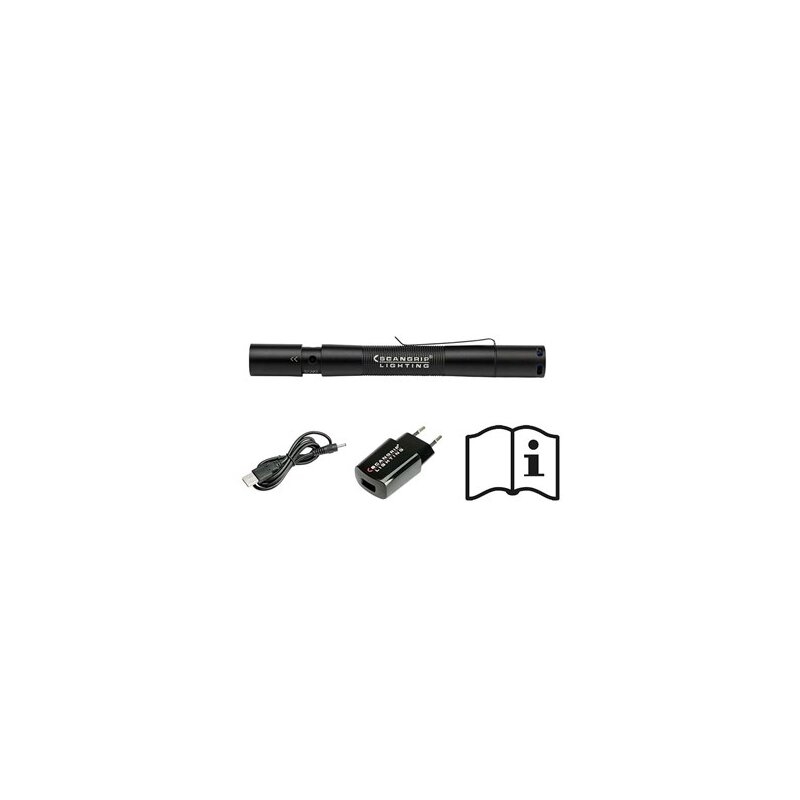 Potente linterna LED tipo lápiz recargable con función de enfoque desde 10º hasta 70º. La linterna se recarga fácilmente a través del cable USB incluido. Incluye batería recargable 3.7V / 1100 mAh Li-ion.