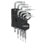 Llave Torx RATIO micro 5284. Especialmente indicadas para electrónica. A diferencia de las llaves Allen, las llaves Torx cuentan con una barra circular en lugar de hexagonal y extremos en forma de estrella de seis puntas. Por su diseño, los tornillos de cabeza Torx resisten muy bien el efecto cam-out, es decir, que la varilla del destornillador resbale o se deslice indeseadamente del tornillo. Este juego de 8 piezas está integrado por 3 llaves Torx (T1-T2-T3) y 5 llaves Torx Seguridad (T4-T5-T6-T7-T8). Destaca su resistencia, su excelente calidad y su confección en acero S2 satinado. Se presentan en un soporte de plástico articulado.